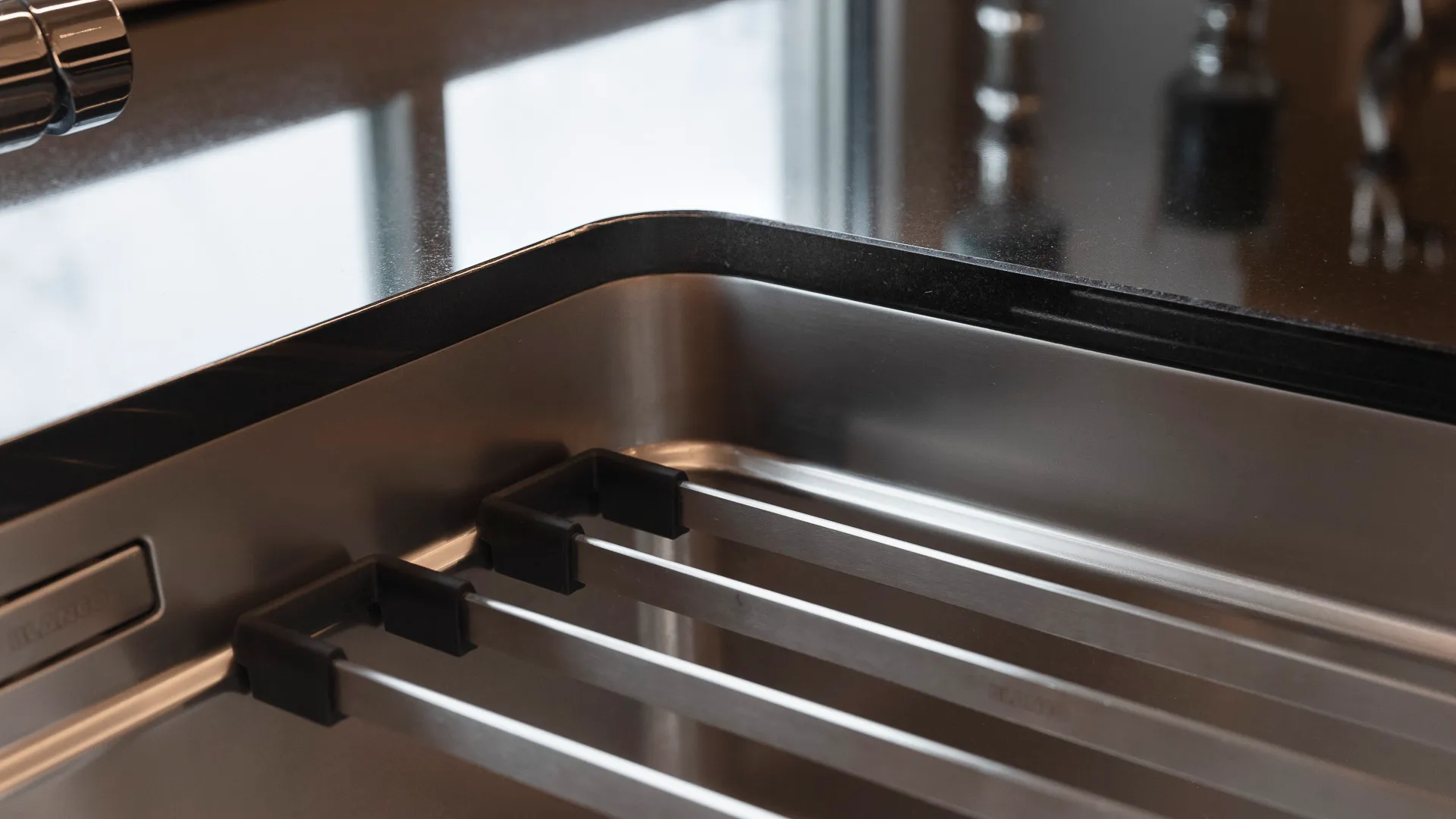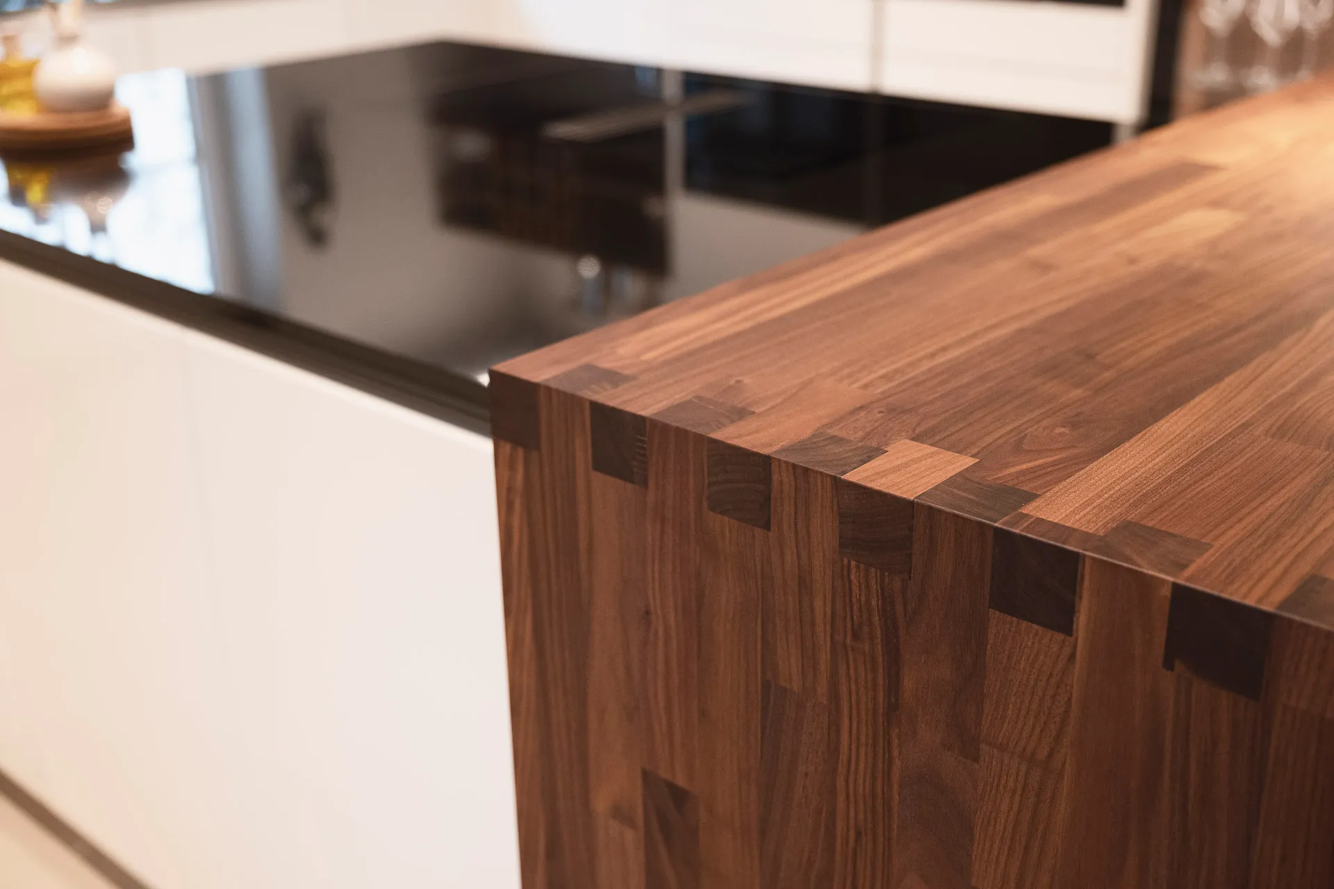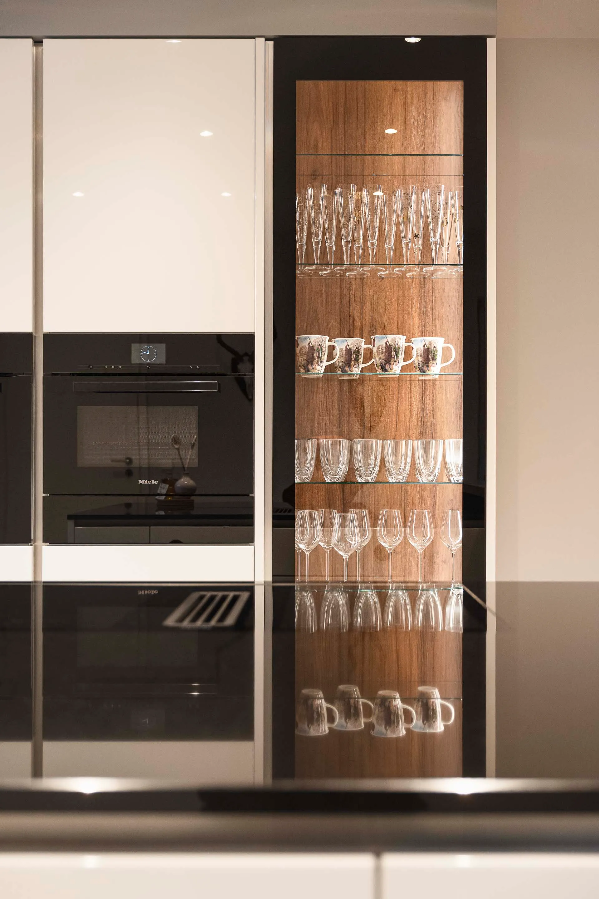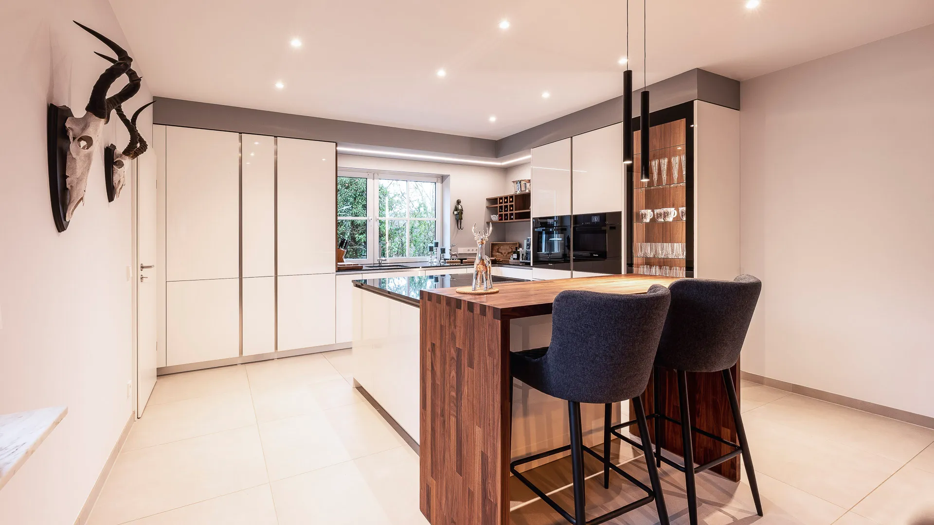 Eine Küche für Naturfreunde und Jagdbegeisterte. Das Zusammenspiel der hochwertigen Materialien aus Hochglanz-Front, Naturstein Arbeitsplatte und Holzelementen gibt dem Raum eine warme Atmosphäre. Individuell geplant von unseren Innenarchitekten, inklusive der Koordination aller Gewerke.