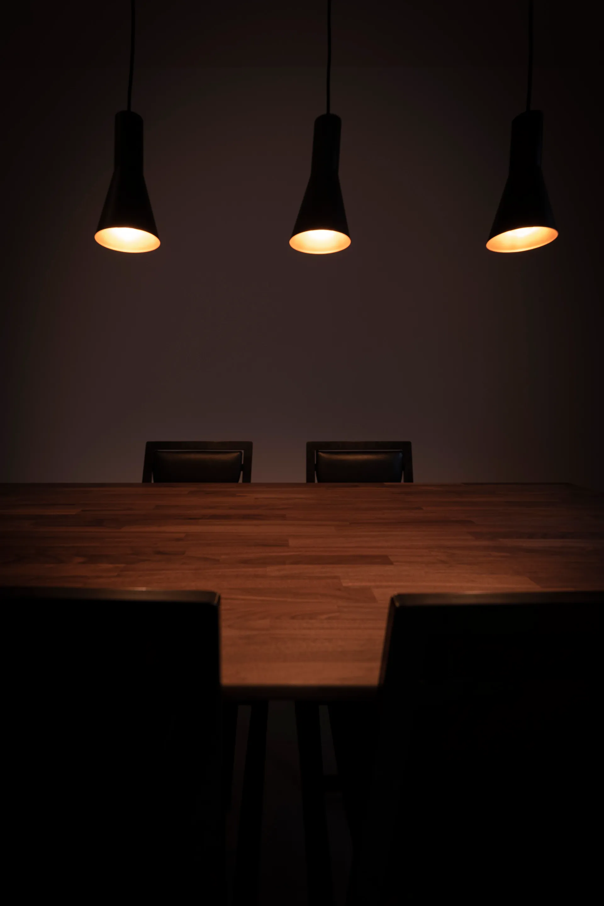 Küche hochglanz weiß mit Inselarbeitsplatte Naturstein schwarz und Holztisch.