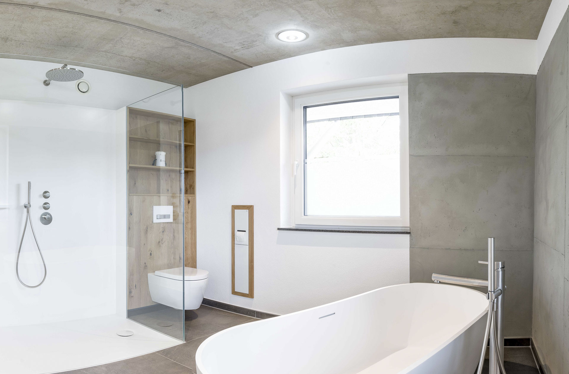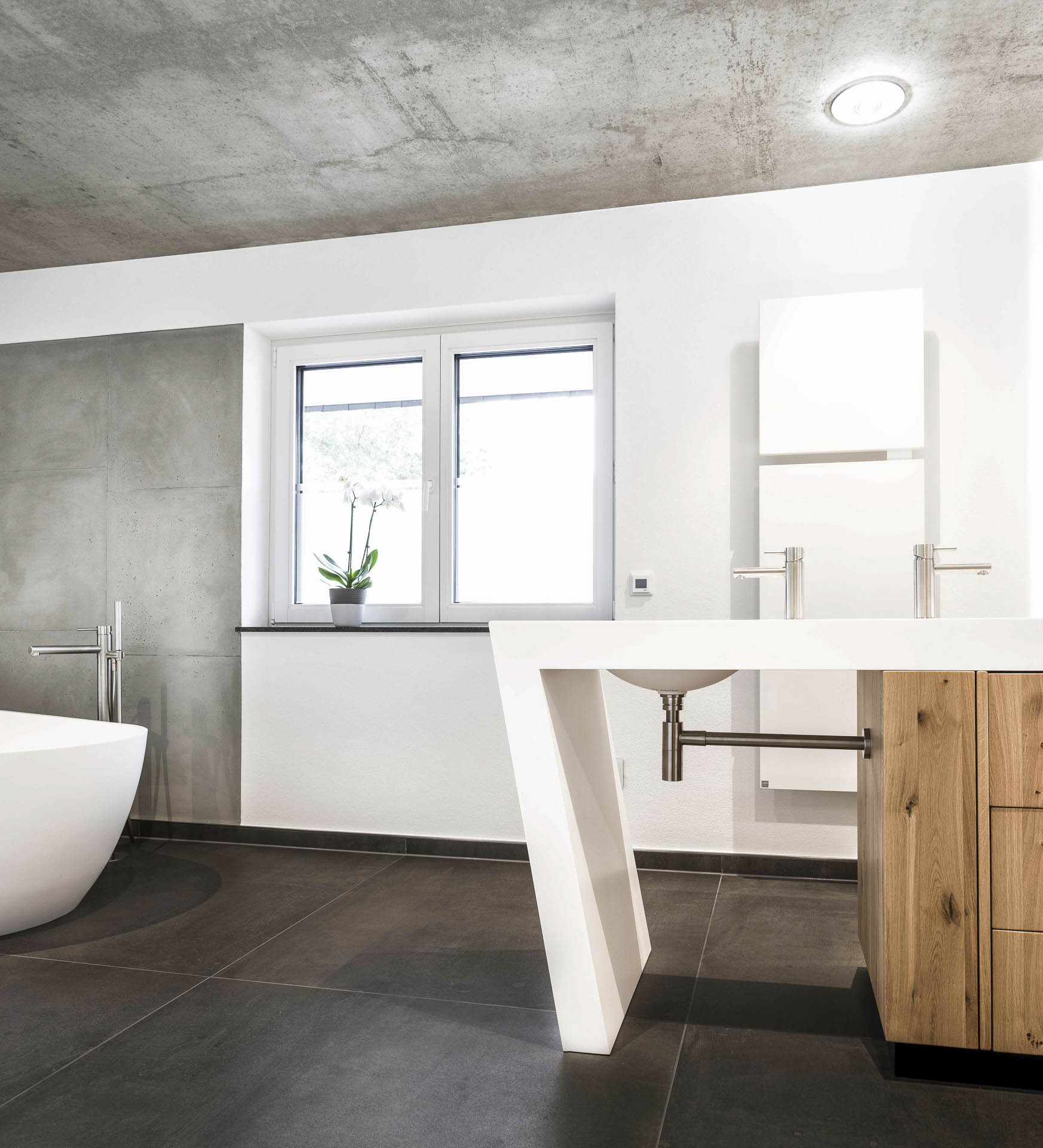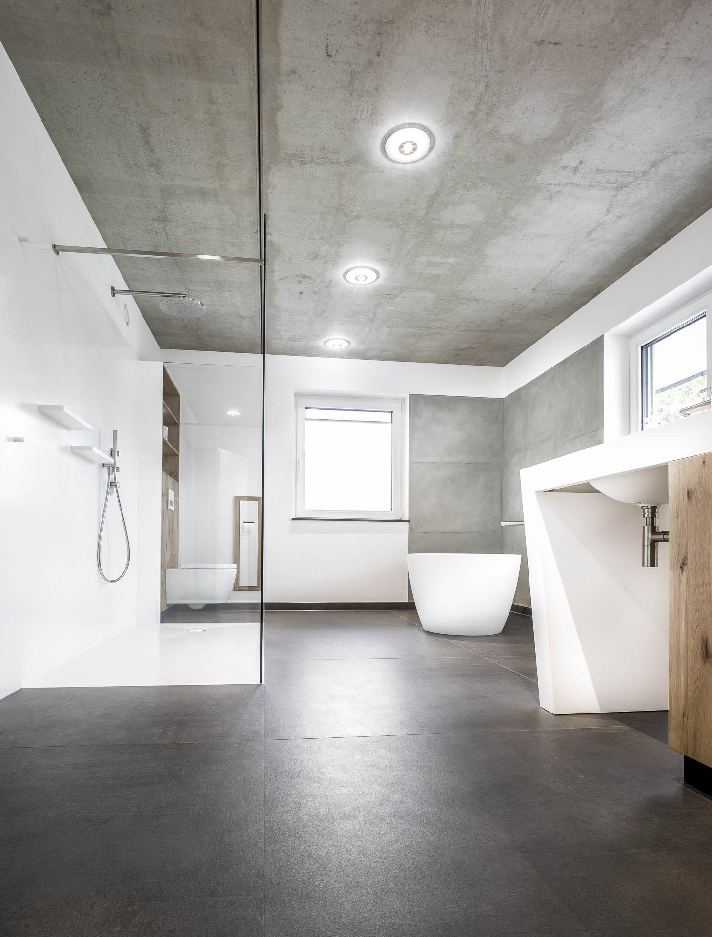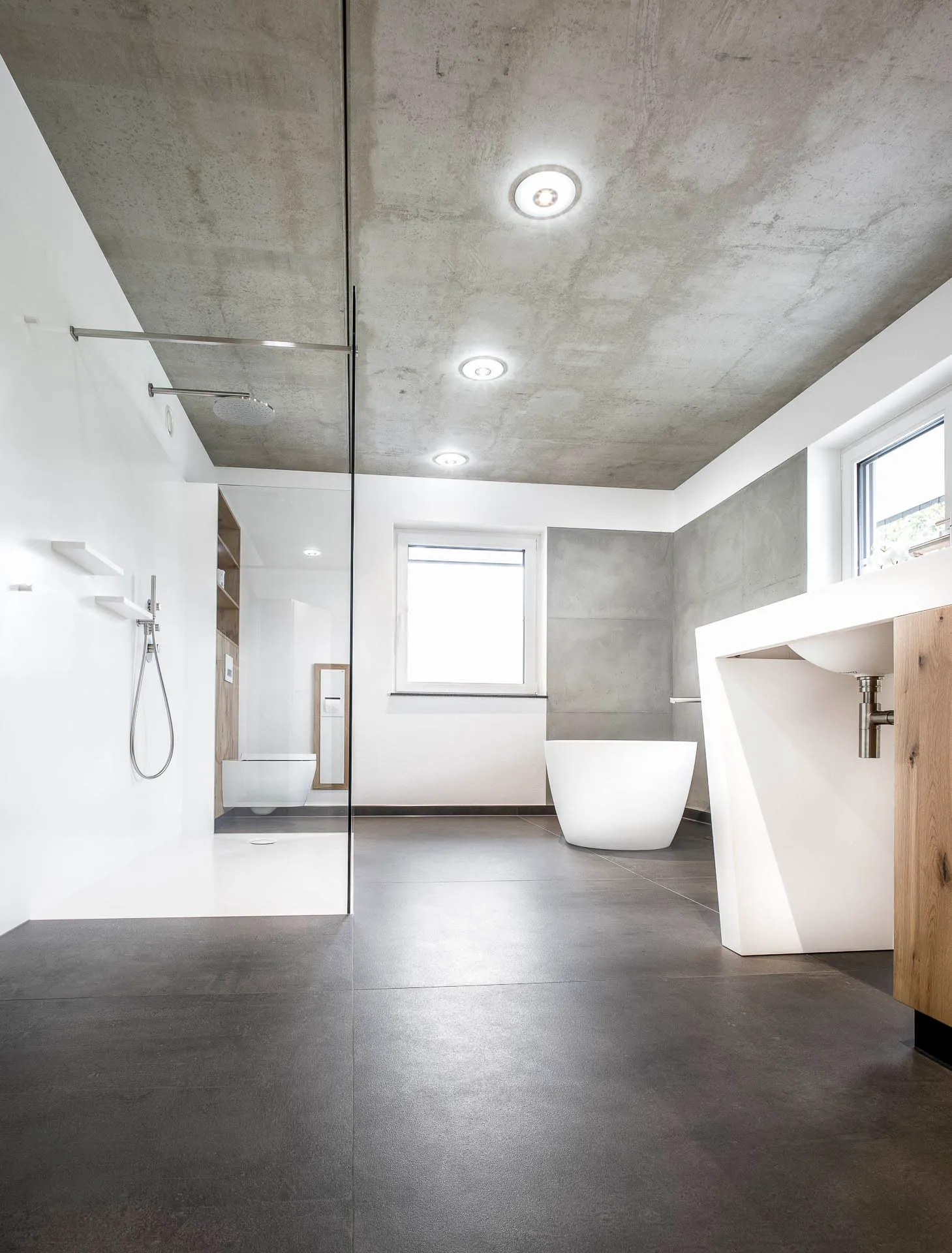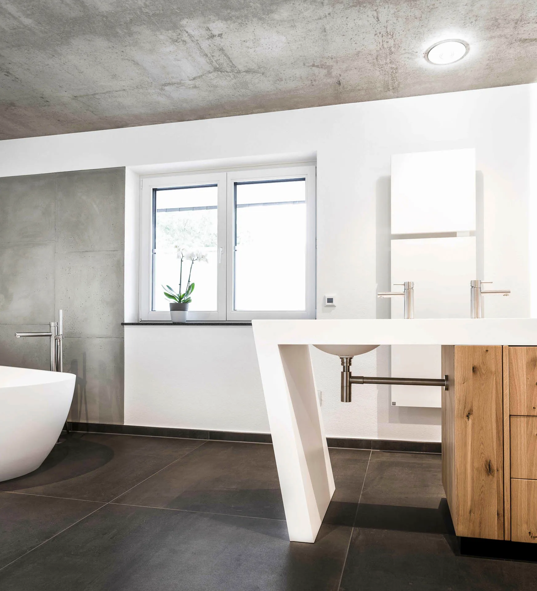 Ein geräumige Dusche aus hochwertigem Mineralwerkstoff, eine freistehende Badewanne und ein individuell angefertigter Waschtisch in einer Komination aus Mineralwerkstoff und Holz.
