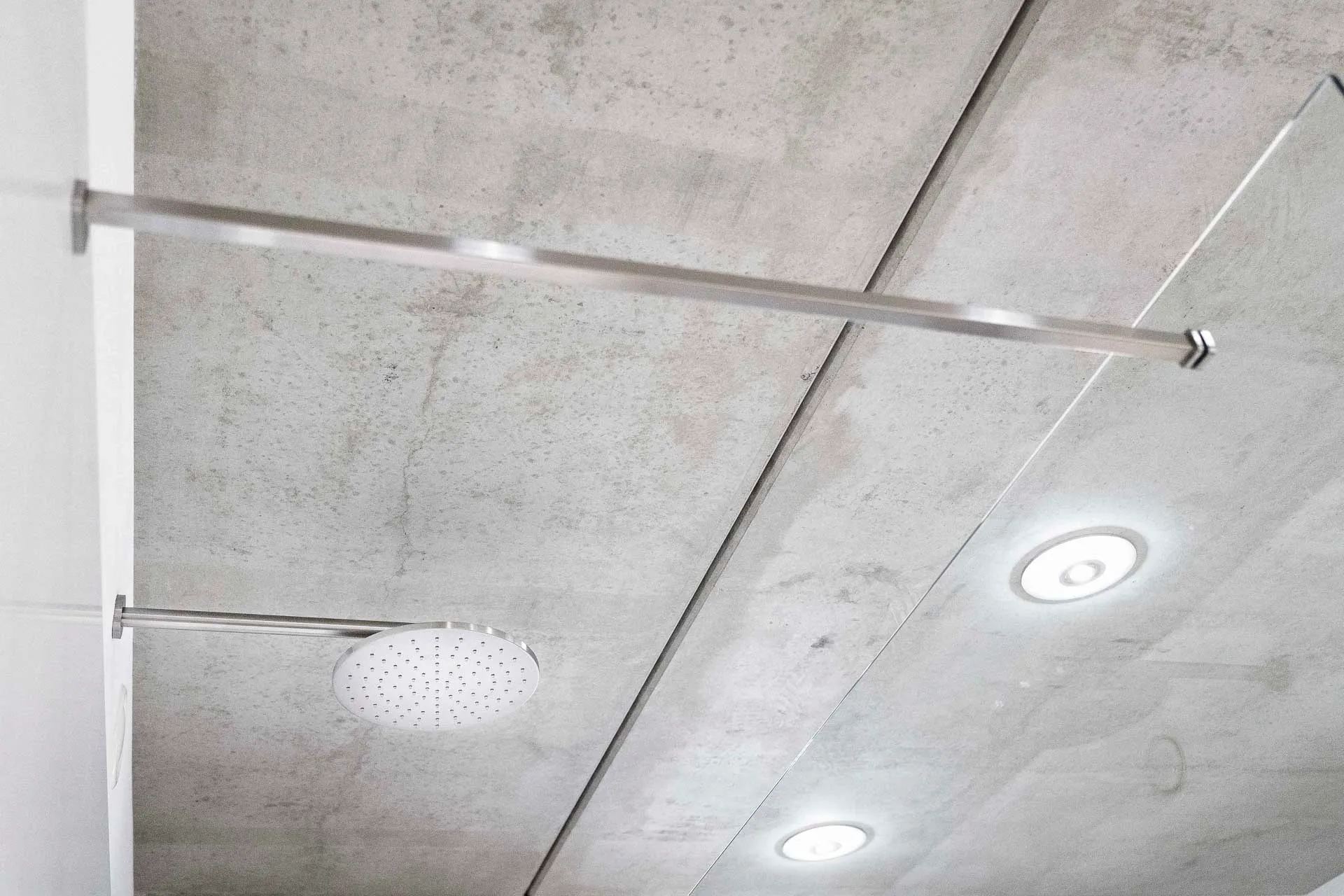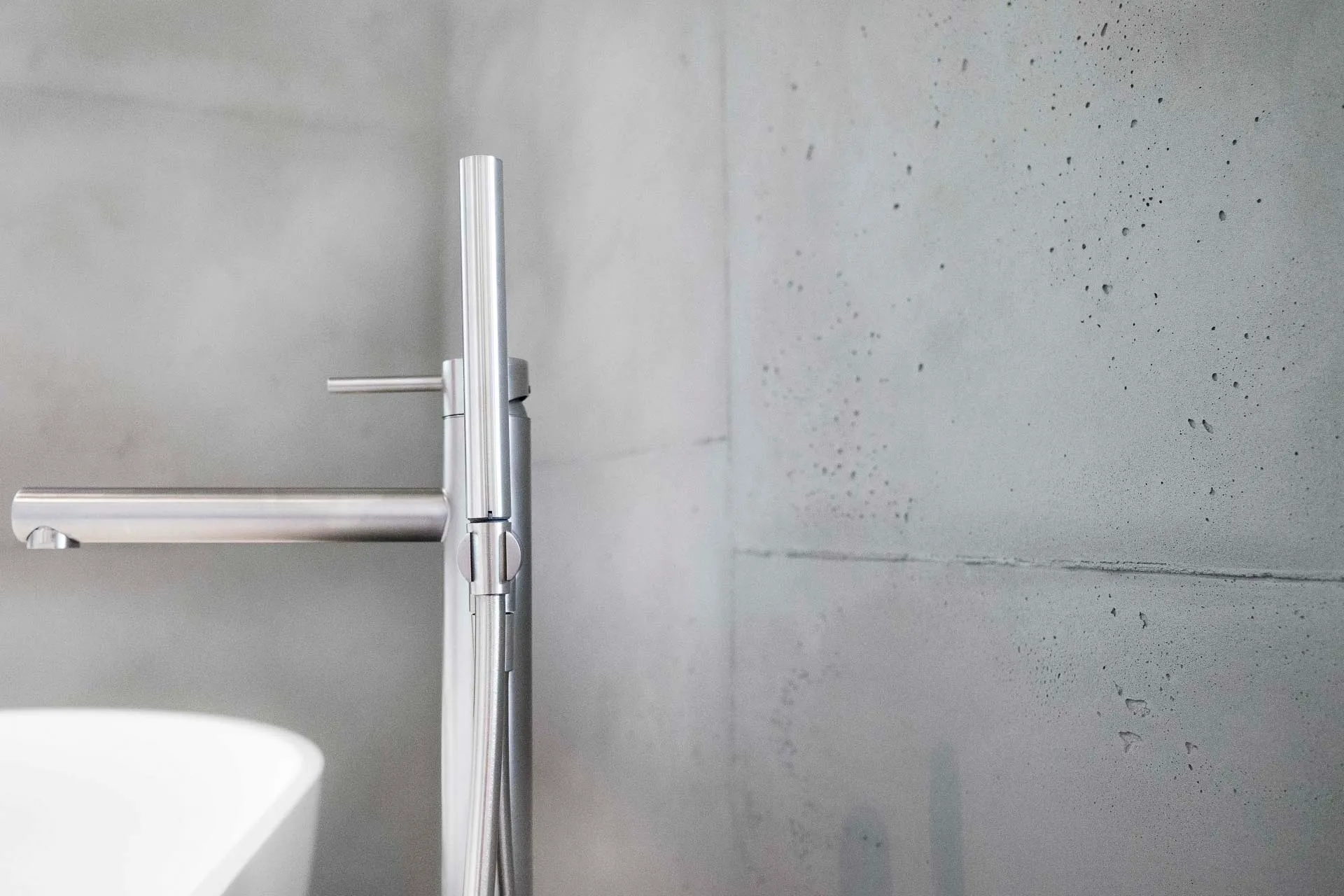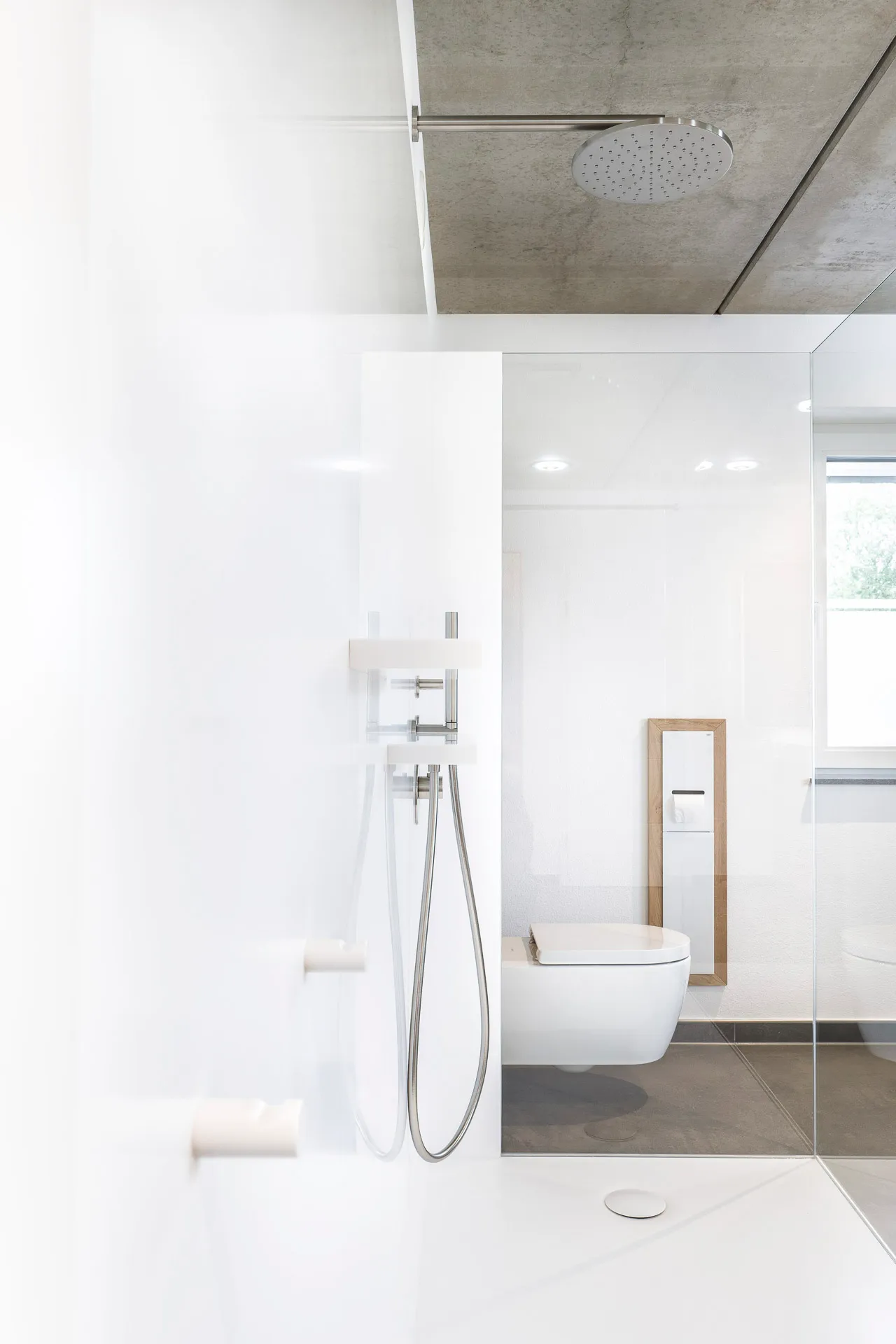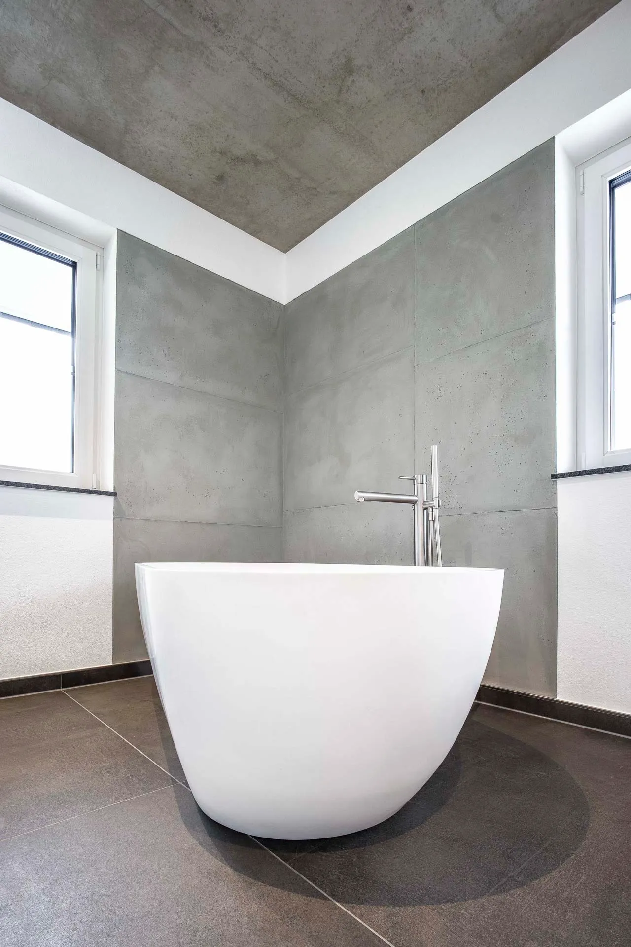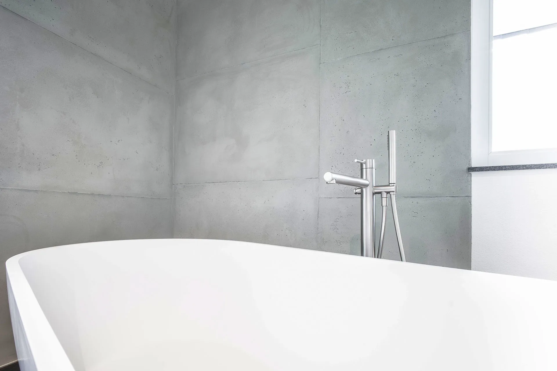 Ein geräumige Dusche aus hochwertigem Mineralwerkstoff, eine freistehende Badewanne und ein individuell angefertigter Waschtisch in einer Komination aus Mineralwerkstoff und Holz.