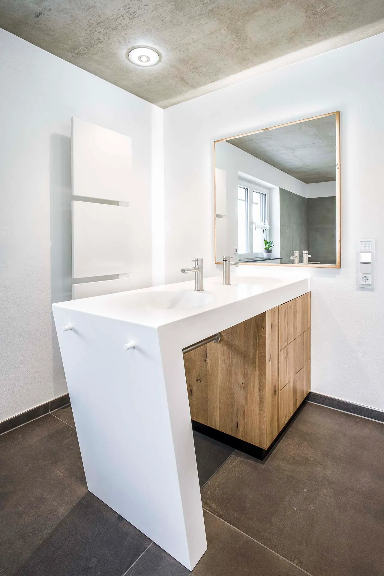 Geräumiges Privatbad mit toller Kombination aus weißem Mineralwerkstoff und Holz