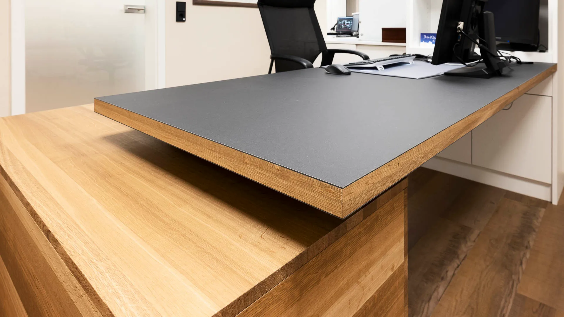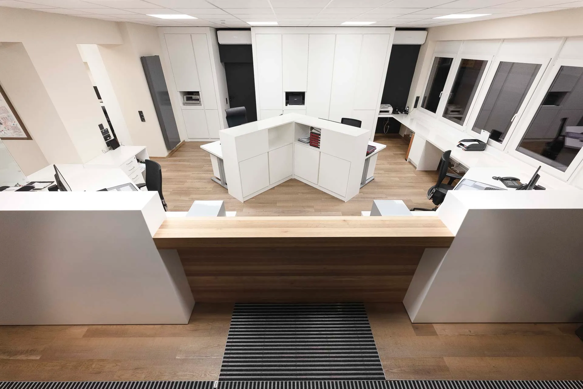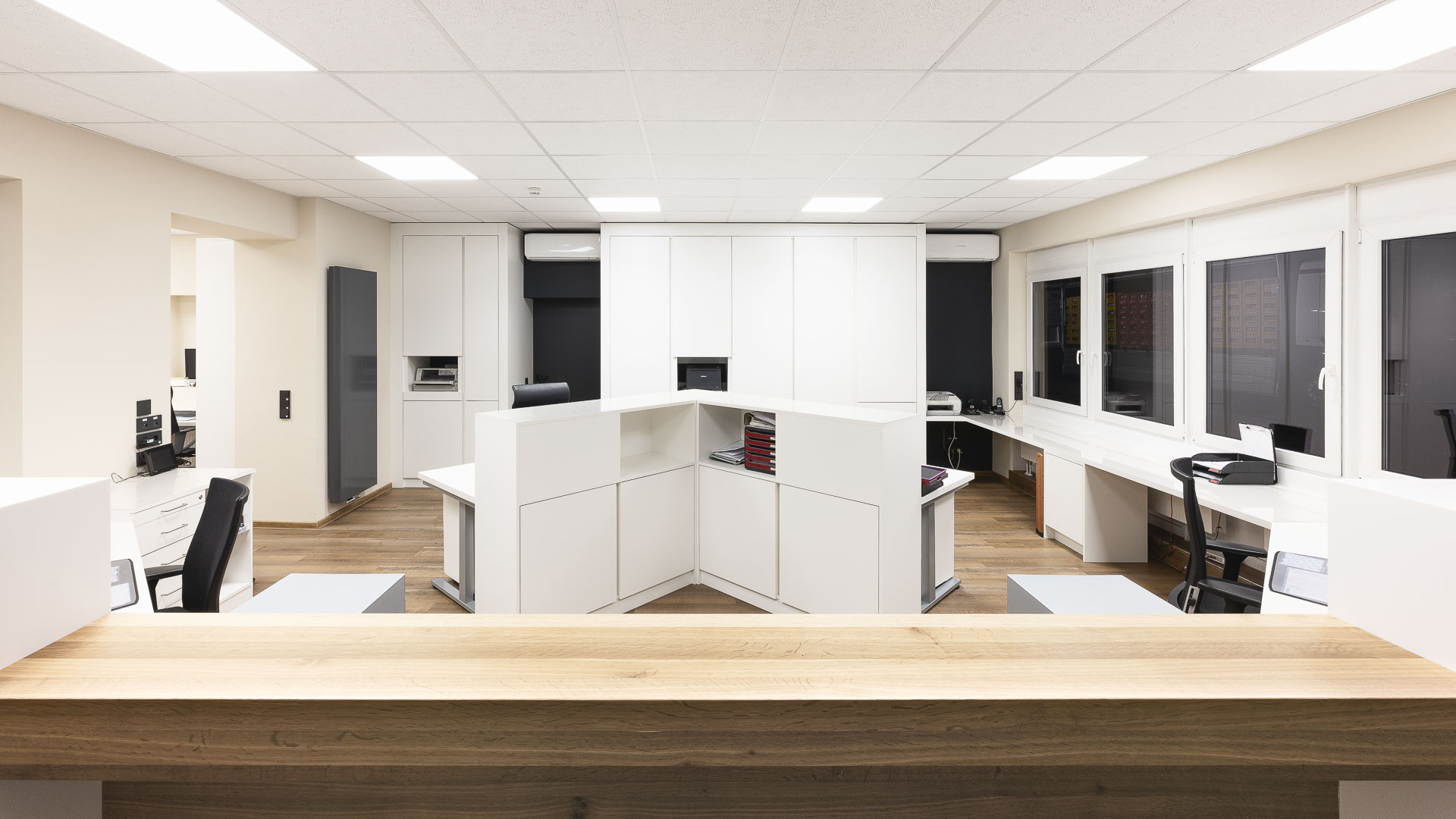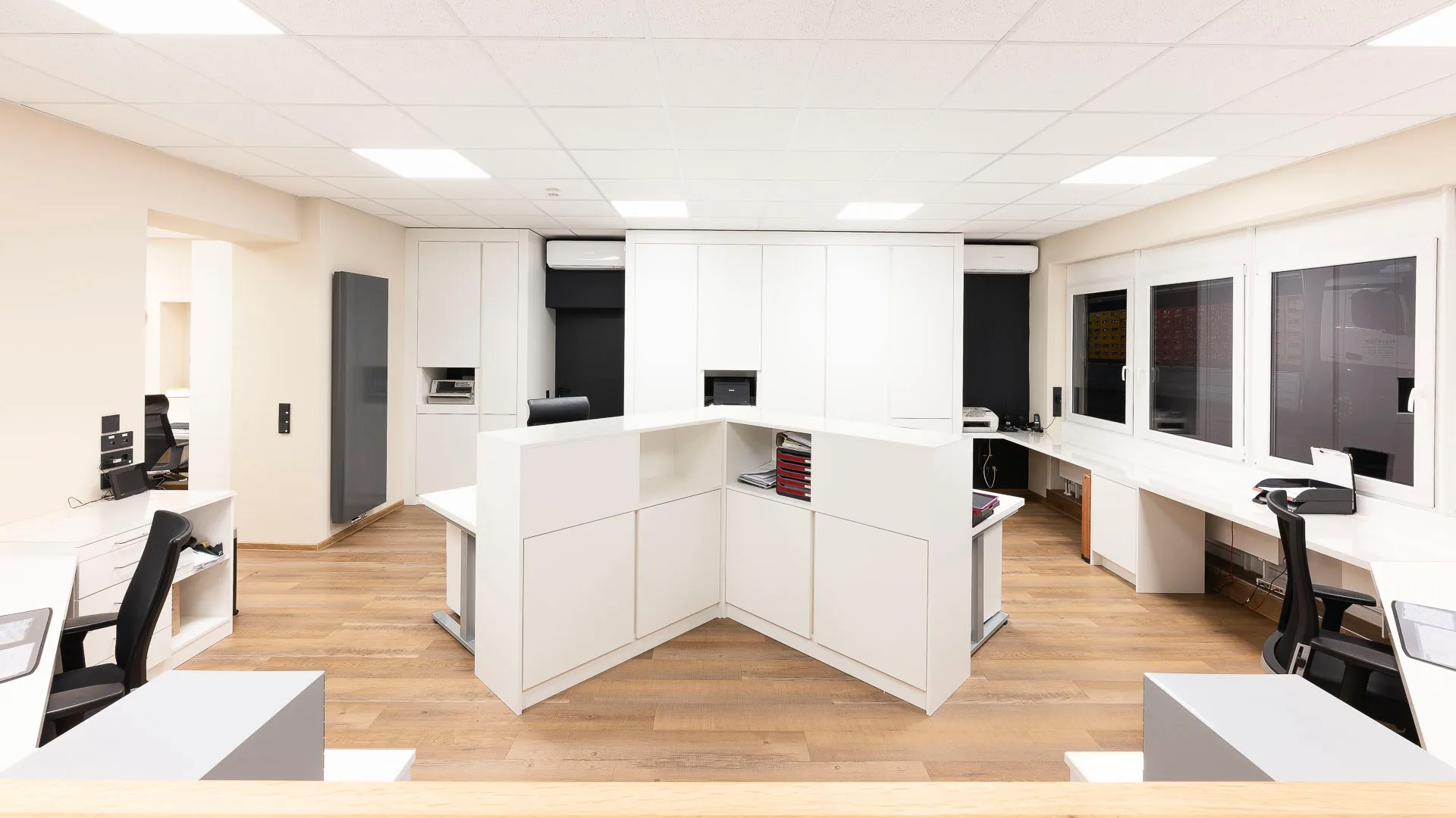Neugestaltung der Büroräume mit Empfangstresen-Anlage. Mit der Neugestaltung des Büroraums sollen klare Zeichen gesetzt werden für Offenheit, Professionalität und Wohlbefinden am Arbeitsplatz. Die Raumgestaltung verbindet Funktionalität mit ästhetischem Anspruch: Helle Farben, ergonomisches Mobiliar schaffen eine angenehme Atmosphäre, die Konzentration und Kommunikation gleichermaßen fördert. Diese Neugestaltung soll nicht nur die räumlichen Bedingungen verbessern, sondern auch ein Arbeitsumfeld schaffen, das die Unternehmenskultur widerspiegelt: transparent, wertschätzend und zukunftsorientiert.