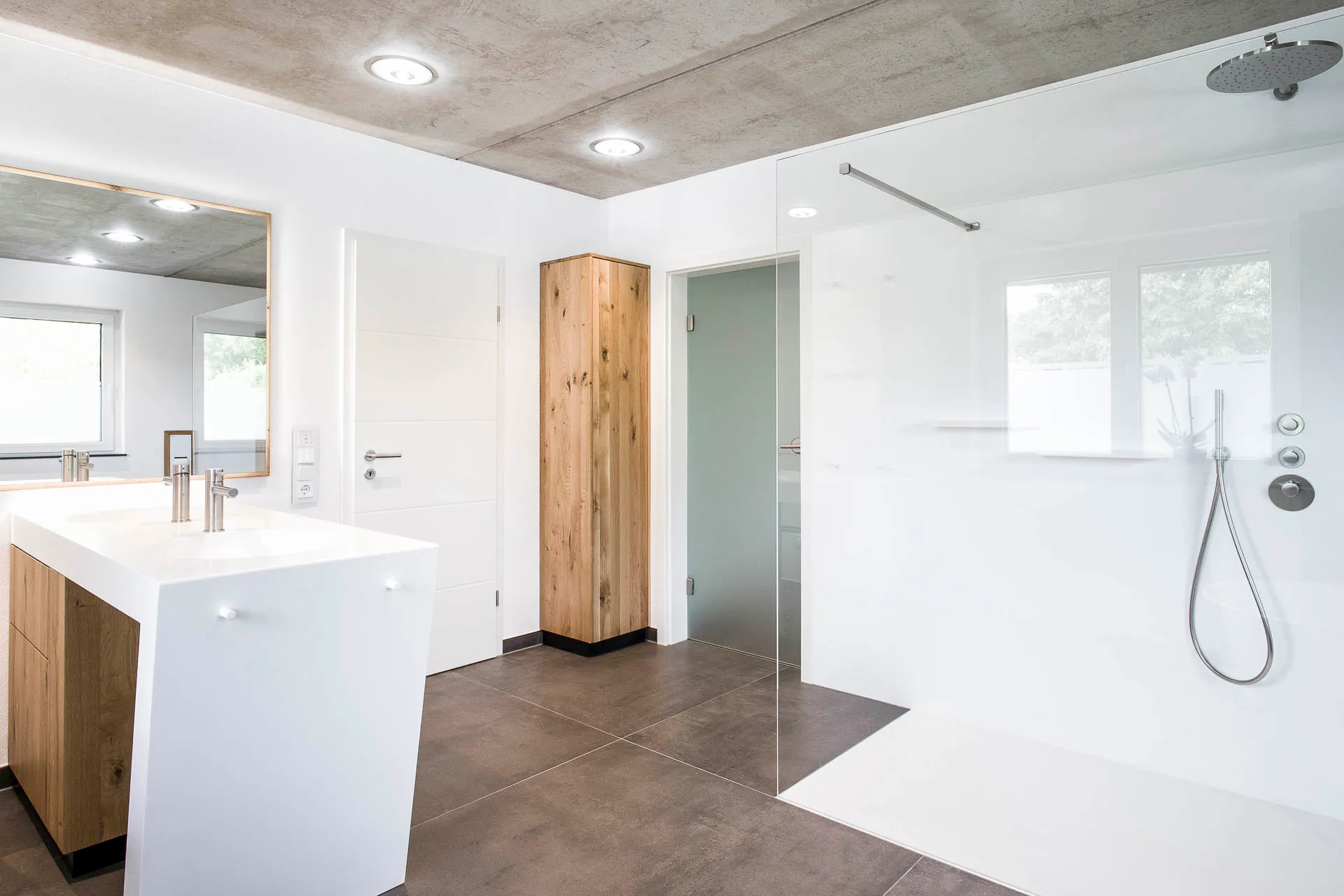 Geräumiges Privatbad mit toller Kombination aus weißem Mineralwerkstoff und Holz